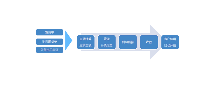 按照付款方式智能结算应收款,自动计算数量,货款,税额,应收日期,管理开票信息,到期自动预警,及时收款,并自动评估客户信用状况。