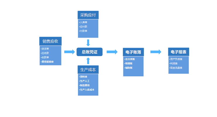 自动从供应链、应收应付、生产制造等模块收集各类原始数据,生成记账凭证,账簿与会计报表